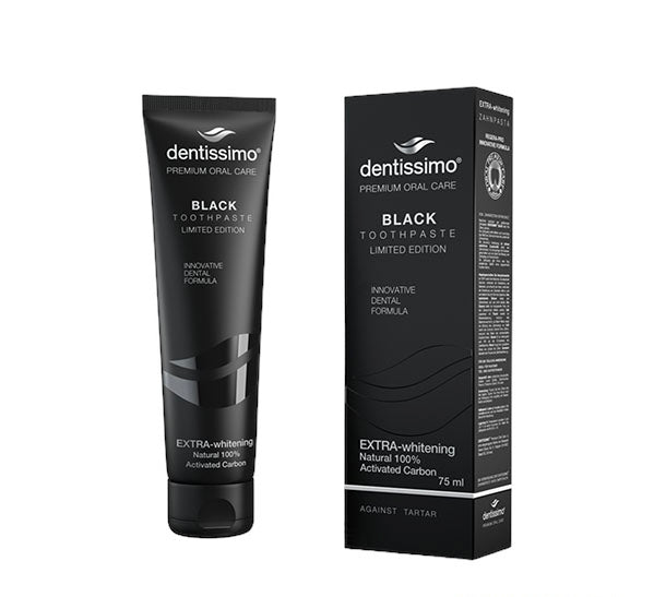 DENTISSIMO BLACK EXTRA WHITENING T/P 75 ML ,toothpastes makes your teeth shining to brilliancy. The toothpaste effectively and safely whitens tooth enamel, polishing your teeth. Innovative combination of active natural ingredients helps to strengthen the tooth enamel, possesses unique anticaries properties and prevents the formation of dental plaque and cavities,Activated carbon is 100% natural vegetable charcoal,It absorbs odors, inhibits the growth of bacteria and ensures fresh breath, effectively protects the tooth enamel from the formation of tartar and normalizes the pH of saliva,The toothpaste gives you a long-lasting feeling of pleasant fresh breat