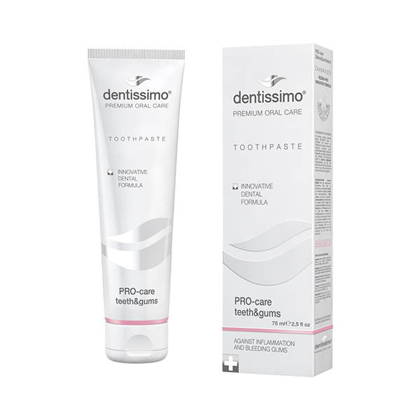 DENTISSIMO PRO CARE TEETH GUMS T/P 75ML,protects teeth and gums from bacterias , It prevents the formation of cavities, periodontitis, gingivitis, stomatitis, effectively treats bleeding gums, stimulates the regeneration of cells, revitalization of the gums. The formulation contains 9 bioactive ingredients, plant extracts and oils. Biomimetic principle of the toothpaste is designed by nature.