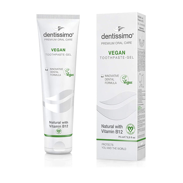 DENTISSIMO VEGAN T/P-GEL NATURAL ;VITAMIN B12 75ML , toothpaste contains cyanocobalamin – vitamin B12 which helps the natural metabolic process of proteins and lipids, assists to decrease the amount of bacteria in the oral cavity thus preventing the appearance of carious cavities,Free from fluoride,For daily use,Helps antibacterial action Assists natural processes, Removes plaque, Reduces sensitivity of teeth and gums.