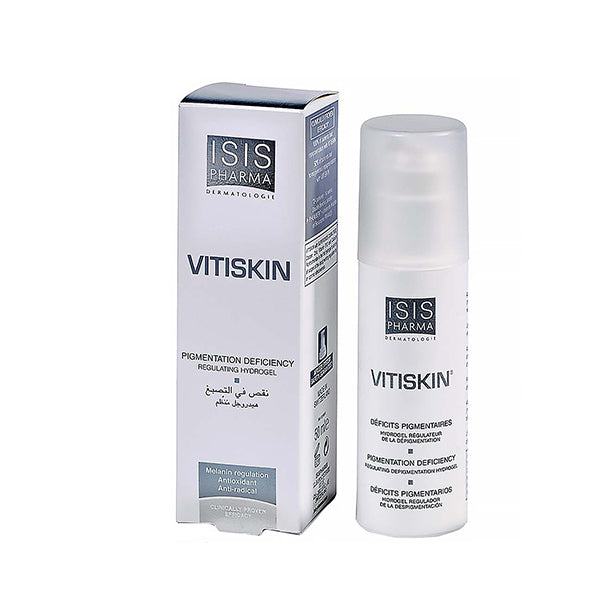 ISIS PHARMA VITISKIN HYDROGEL 50ML,gel for skin with pigmentation deficiency. The association of active ingredients in the formula helps to the repigmentation of the skin. The gel texture penetrates easily and optimizes the absorption of active ingredients. MAIN INGREDIENTS PROPERTIES SOD (superoxide dismutase): decreases free radicals and restores the antioxidant balance COPPER + ZINC: Re-balance persons deficiency, catalyse the SOD and enhance the tyrosinase activity VITAMIN B12: Re-balance persons deficiency and favorises the regulation of the melanin synthesis CALCIUM PANTHOTENATE (vit B5): Re-balance persons deficiency and is a precursor of the melanin synthesis