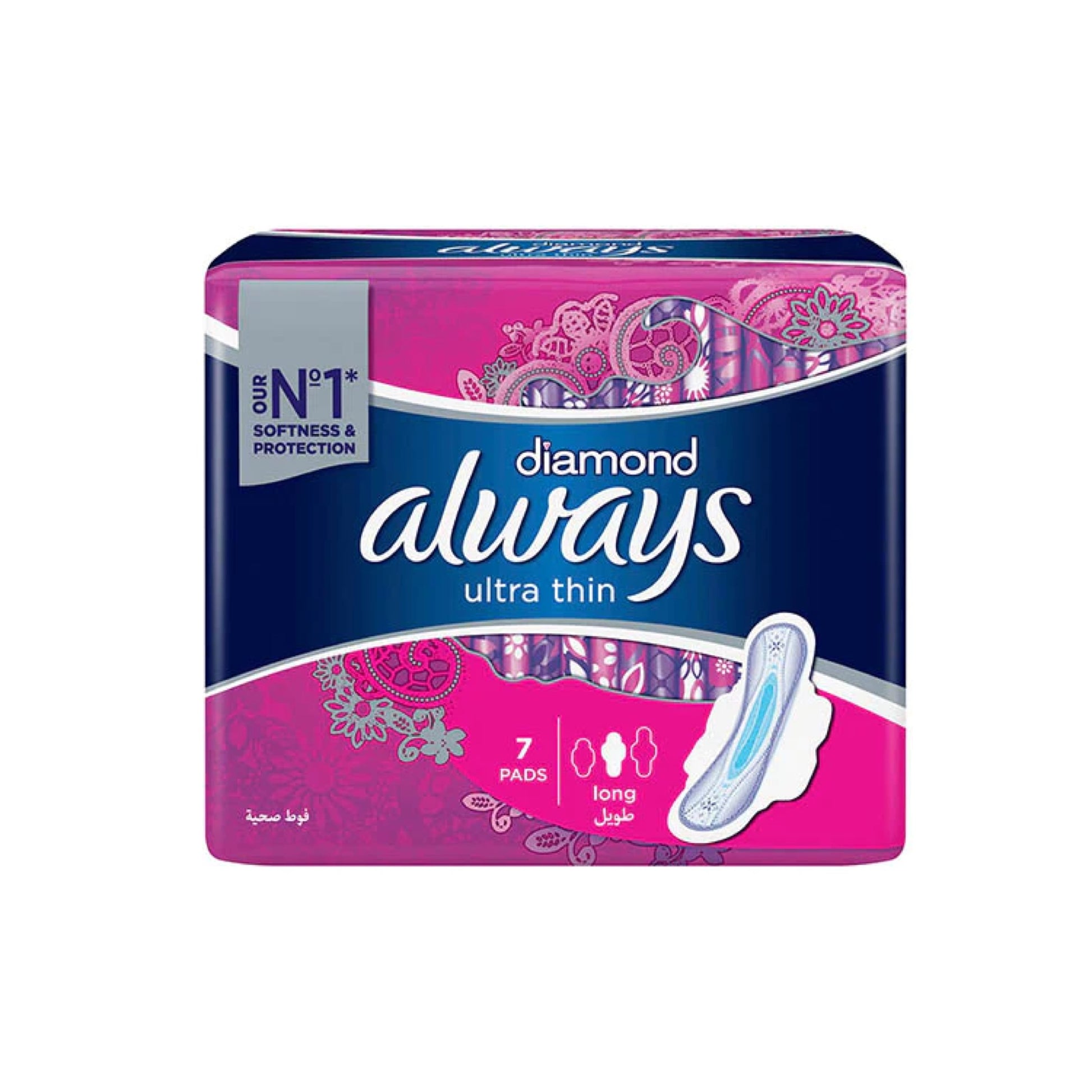 ALWAYS DIAMOND ULTRA THIN 7 PADS , Ultra Thin Sanitary Pad Long Pads. Its extra slim feature will make you feel confident in every way you move because the Blue protection zones and wings (with 6 stretch zones) help the pad to stay in place - so you can be carefree. Always Diamond- Ultra thin with its silk topsheets helps to give you fresh, dry and comfortable feel for a longer time.