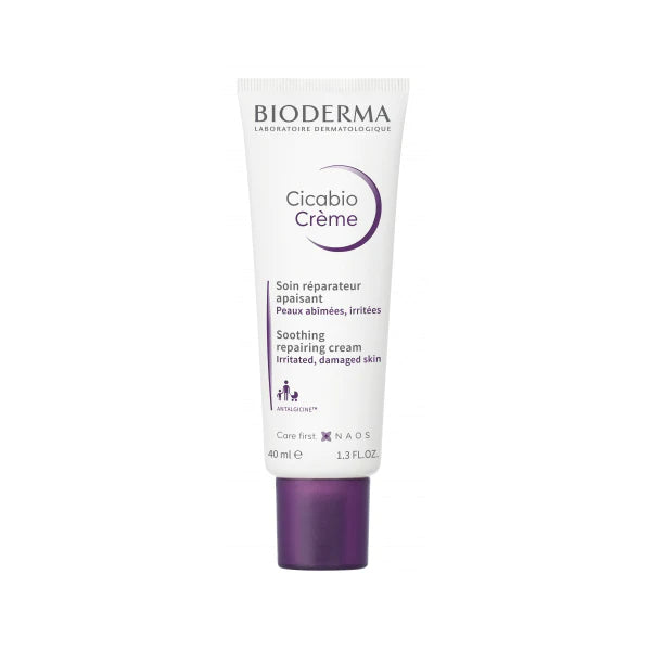 BIODERMA CICABIO CREME SOOTHING REPAIRING CREAM is a soothing renewing care that hydrates, soothes and removes irritations on dry skin. Thanks to the moisturizing power of hyaluronic acid, Cicabio Cream hydrates your skin. Its “dressing effect” texture acts like a protective but breathable film. Thanks to copper sulfate and to a grape seed extract, Cicabio Cream helps to maintain the skin in its optimal environment. it helps to decrease sensation of discomfort. It is suitable for the whole family.